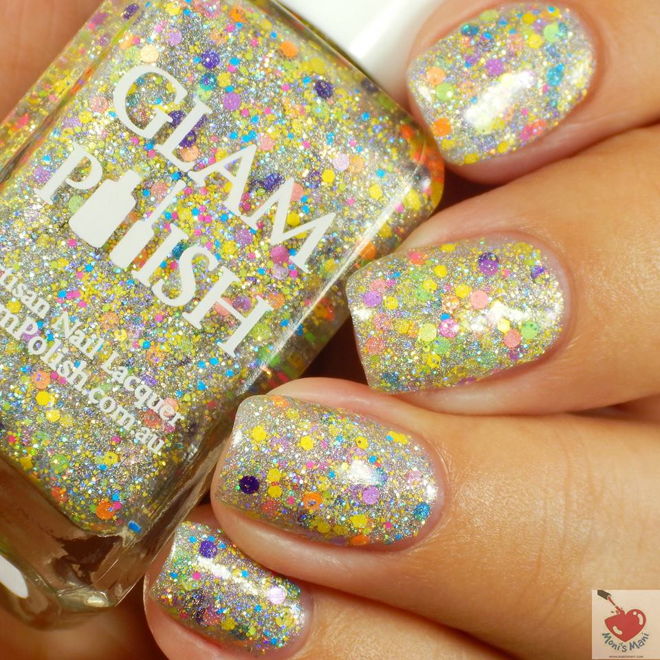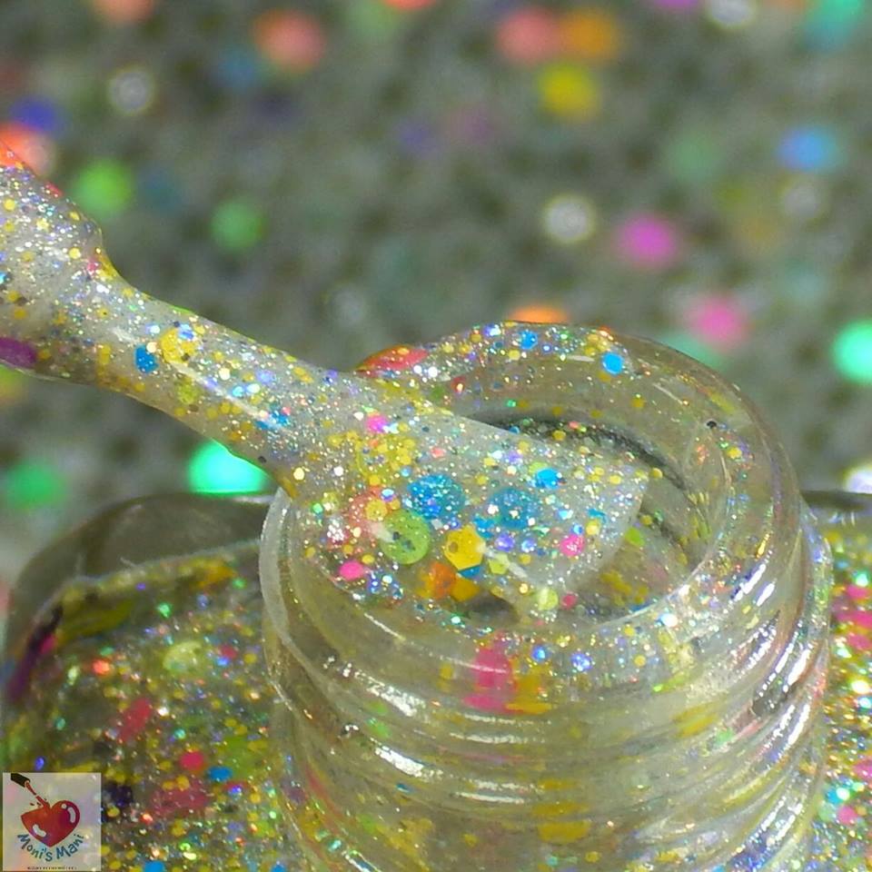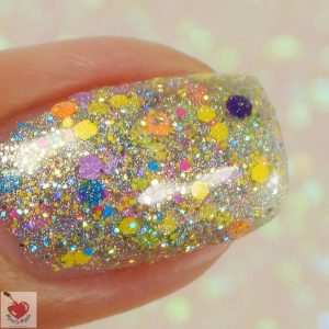Is a mix of yellow, pink and blue glitters in a gorgeous holo base.
