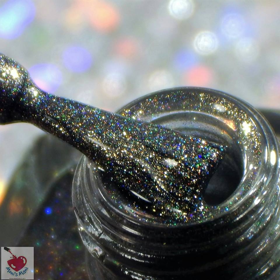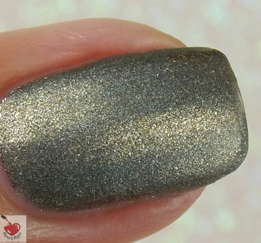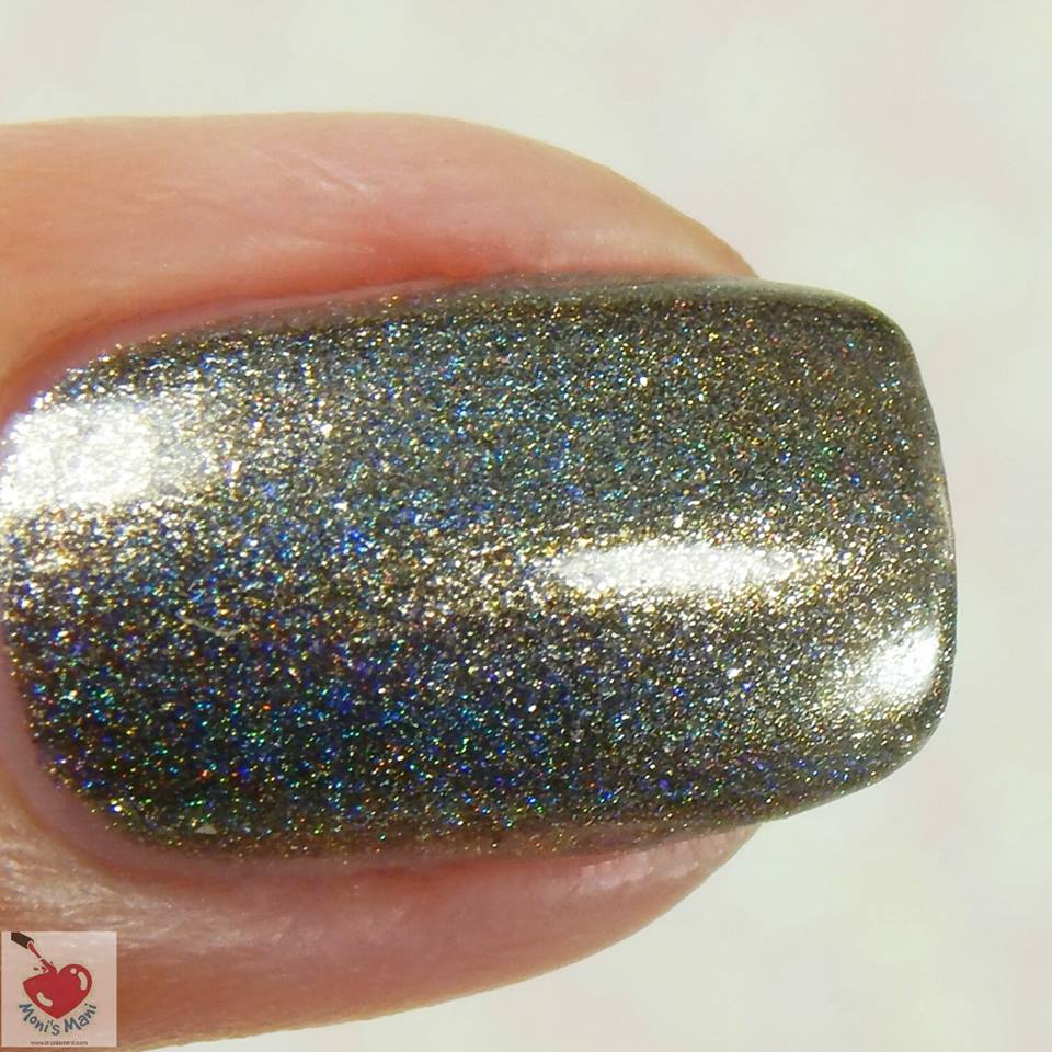 Is a vampy metallic gunmetal linear holo with an antique gold highlight shimmer, designed with Alex and Eli Bacon-Leslie and inspired by the Newsflesh series by Mira Grant.