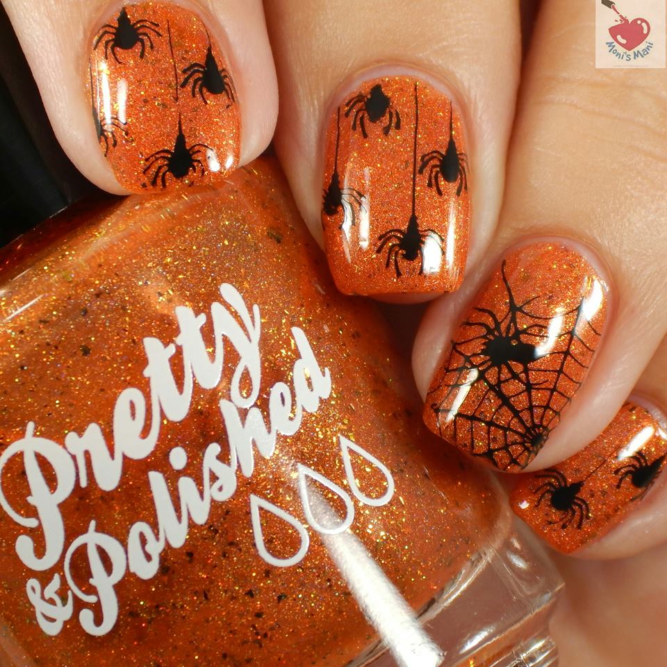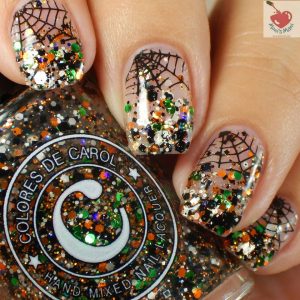 This glitter was perfect! the perfect Halloween treasure if you ask me! I did some negative space art and stamped some webs at the bottom. I don’t recall the plate but I’m pretty sure it’s my MoYou London Festive 16.