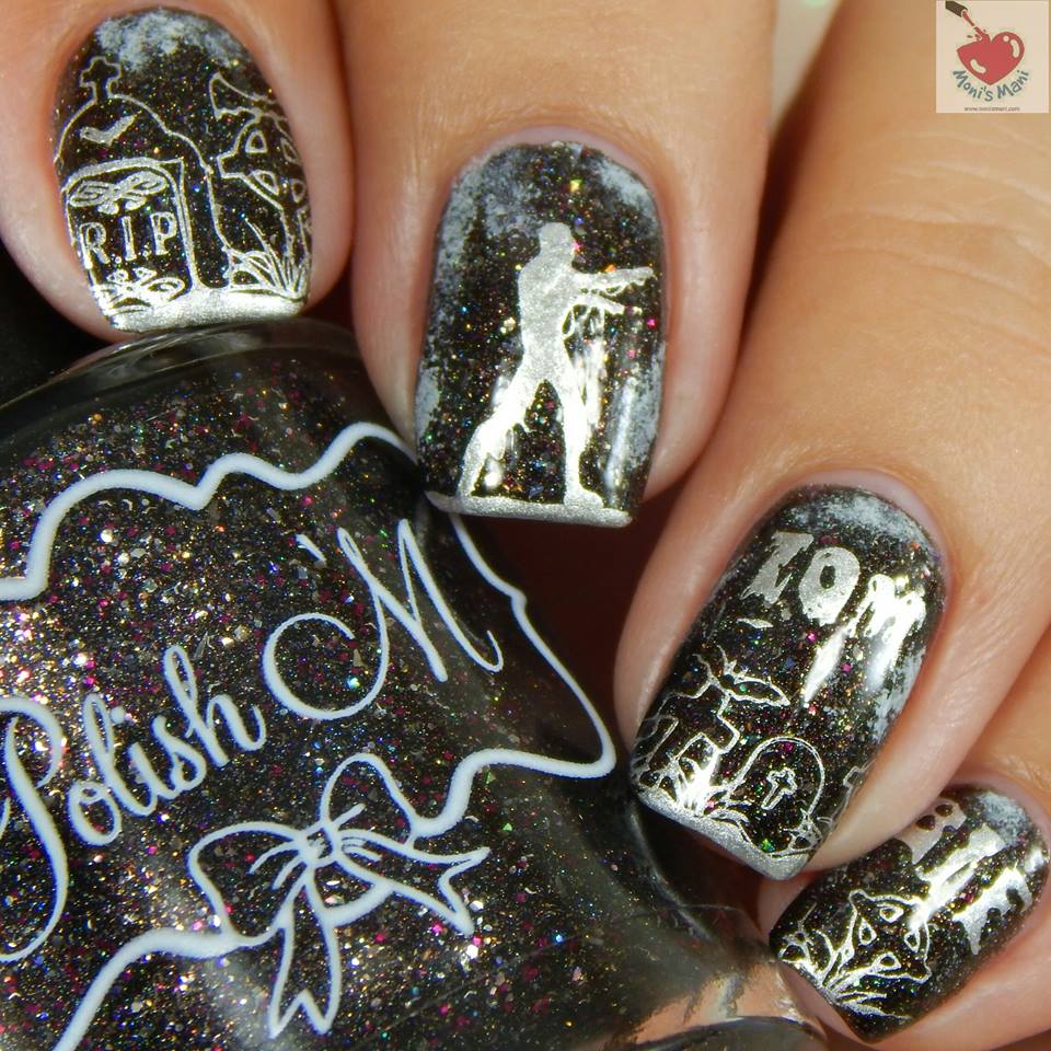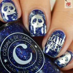 What a gorgeous blue!! I love this shade from CDC what a beauty!! I did some dry brushing with silver and black over the base and then stamped some skulls using a random plate I found on ebay and of course my trusty MoYou London Festive 16 for the word Halloween.