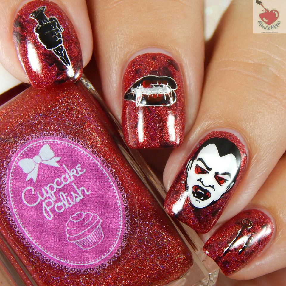 My second favorite ever Halloween mani! gorgeous red base called for some Dracula action. Red base plus some saran wrap technique using black polish. Pointer, middle and pinky fingers were stamped with images from Bundle Monsters Halloween Set and for the ring finger I used an image from MoYou London Festive 16.