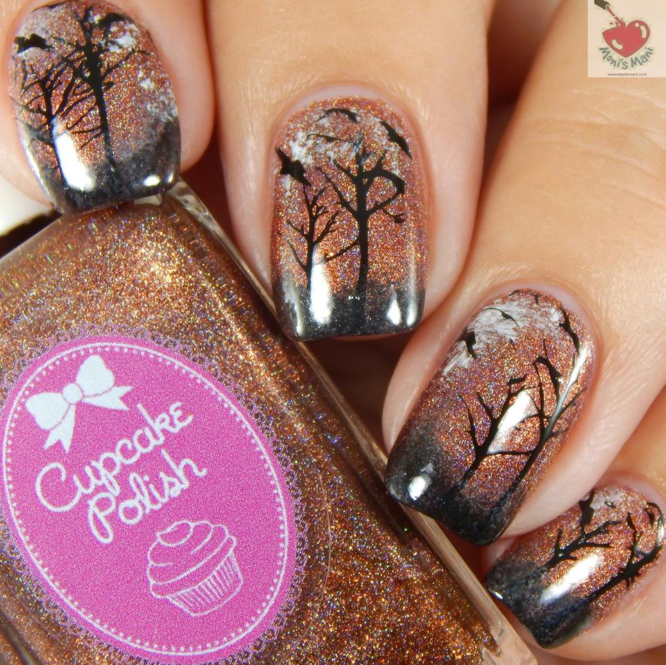 This was a gorge in your face holo with some bat glitters… I drew a spooky scene with trees, a fence and a spooky shadow on my pointer finger.