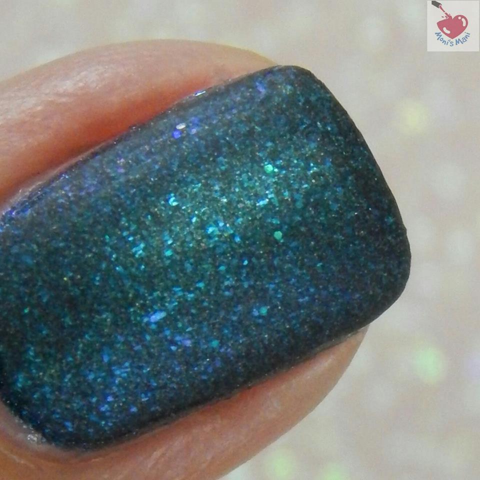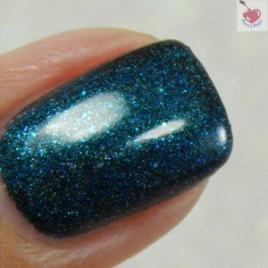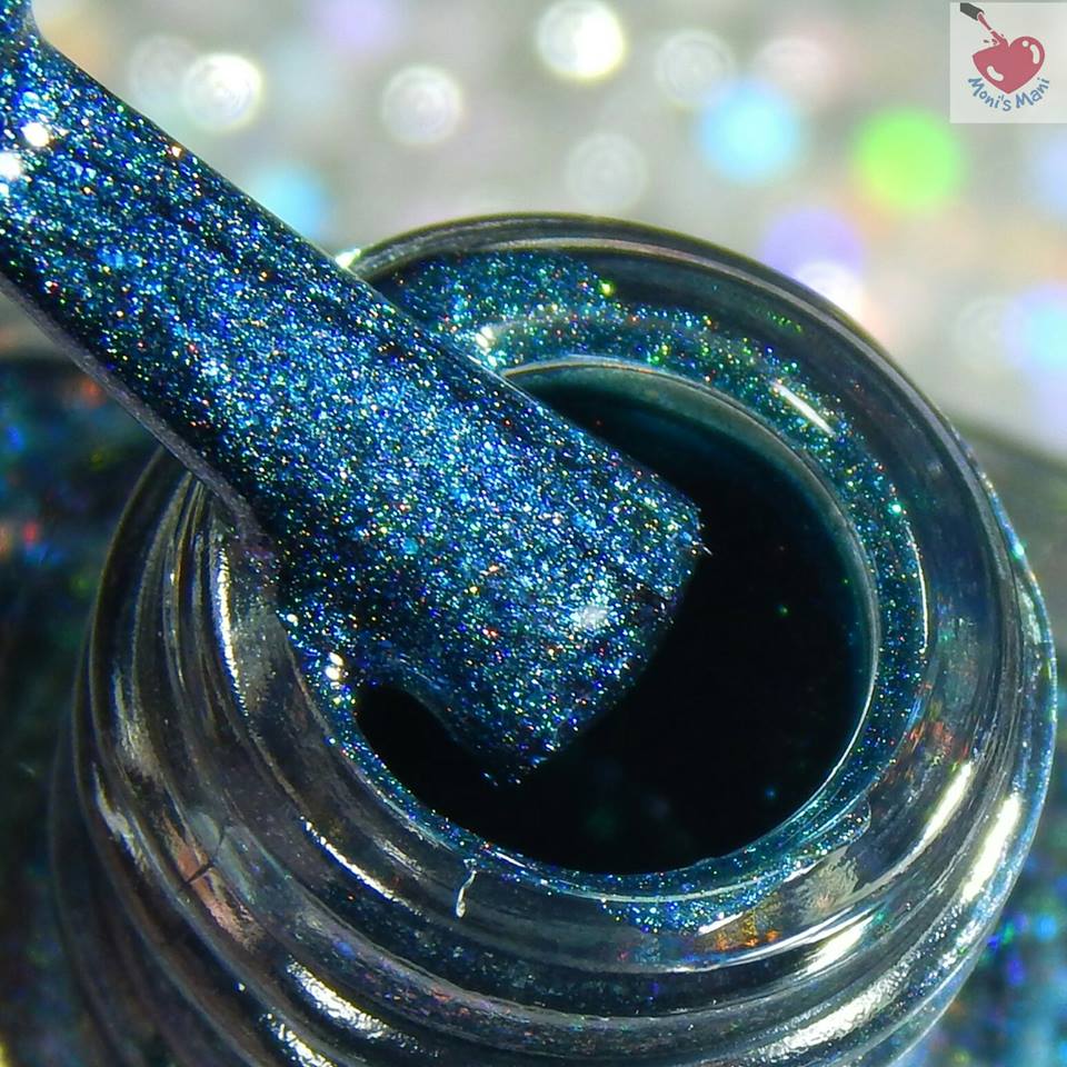 A dark blue/teal holographic duochrome with turquoise-to-purple color shifting shimmer and iridescent blue-to-teal color shifting microglitter.