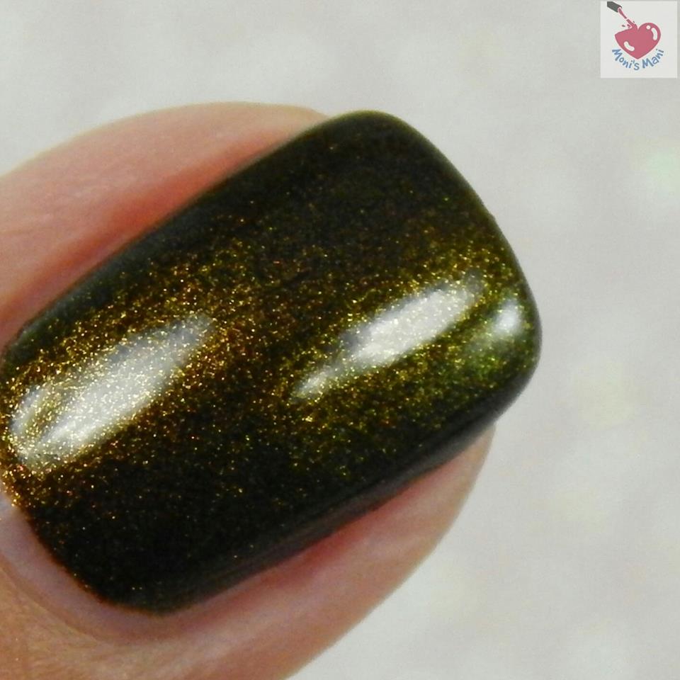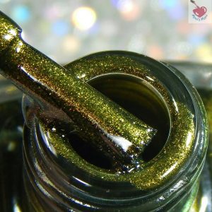 An olive-green based multichrome that shifts in color from bronze to gold to green