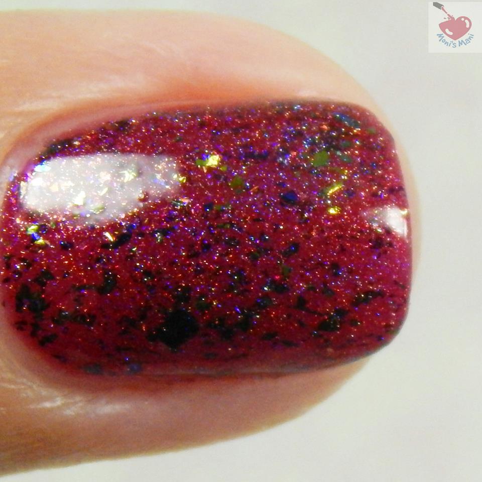 Is a deep red subtle holo with pink shimmer and color shifting ultrachrome flakes.