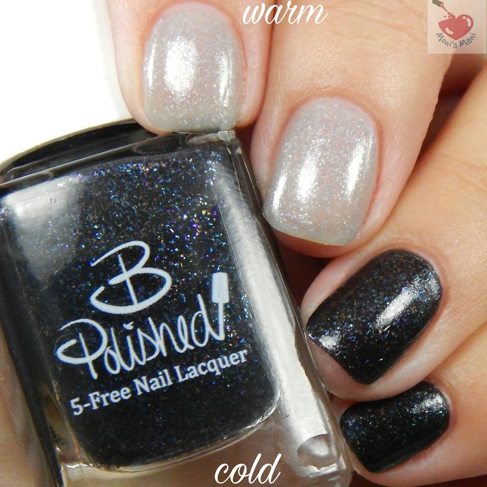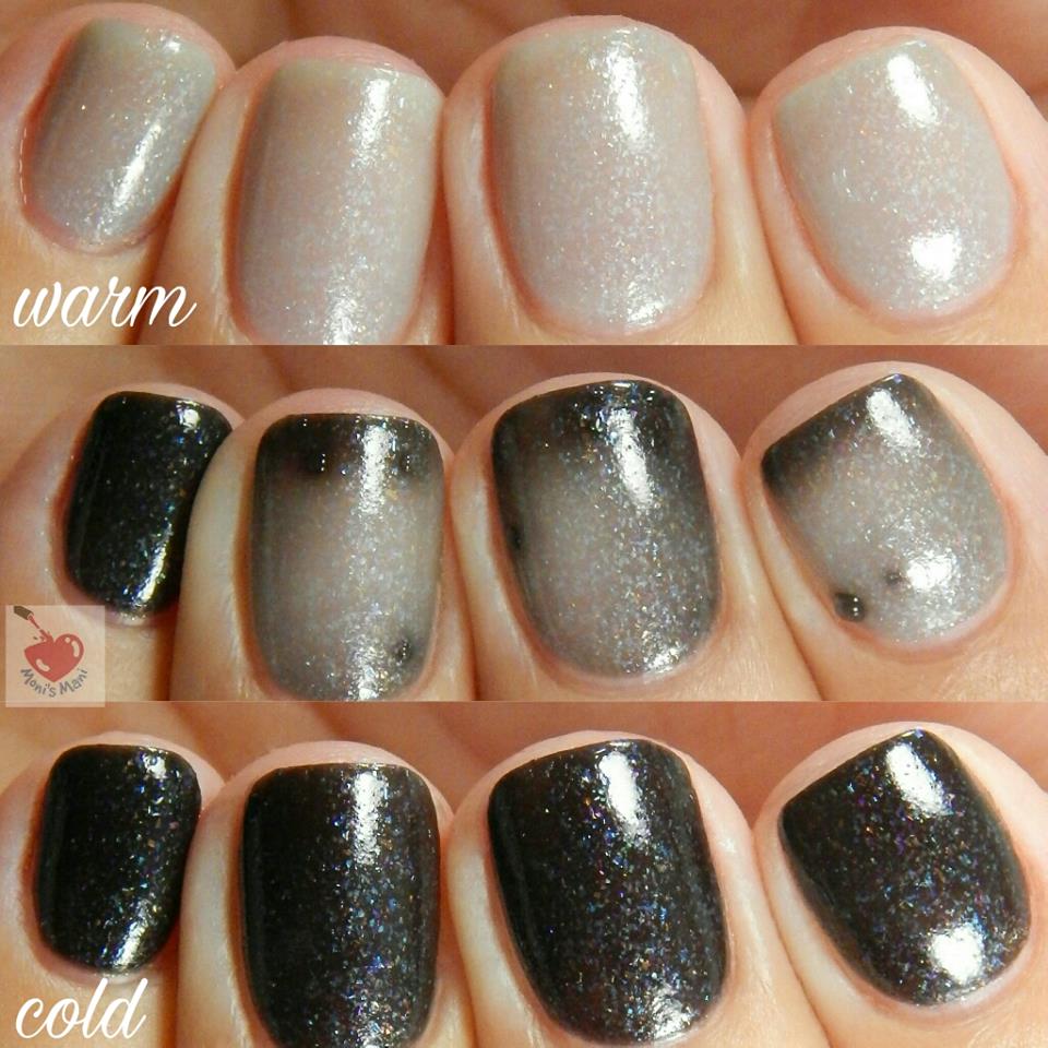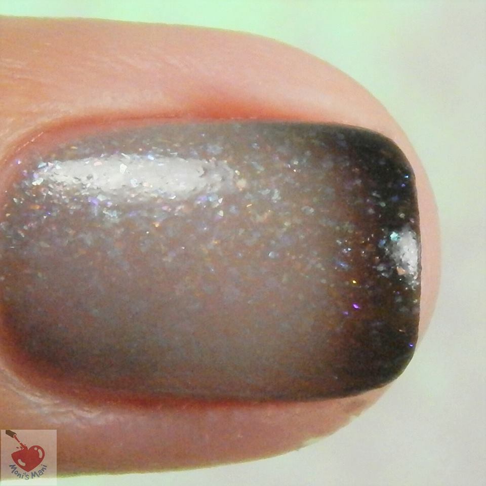 Knits & News is a rich black thermal filled with rainbow micro flakes to a clear grey when warm. Inspired by both of the maker’s paternal grandparents and their love of reading the daily newspaper and crocheting. You see three thin coats plus glossy top coat in the pics.