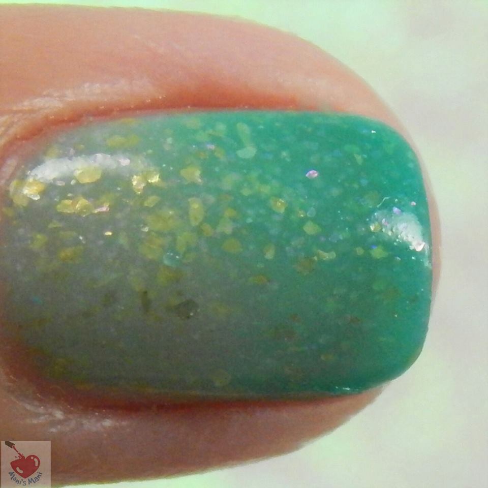 Forty-Seven Eleven is a gold, yellow, and rose flaky filled turquoise thermal that shifts to a clear pale green. This polish is inspired by the maker’s maternal grandfather who always had the largest bottle possible of 4711 sitting on the bathroom vanity. You see three thin coats plus glossy top coat.