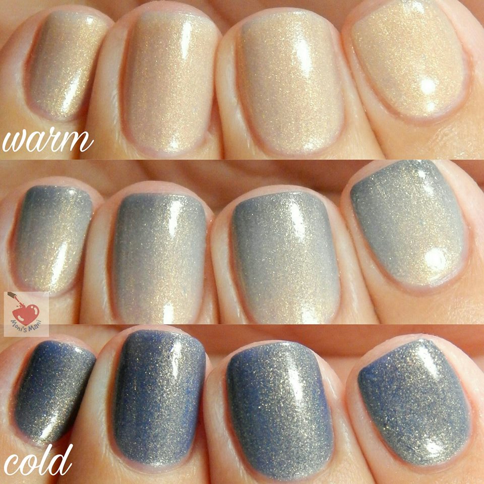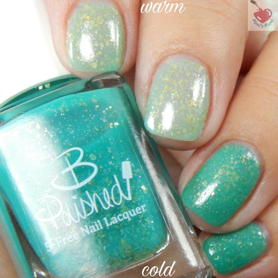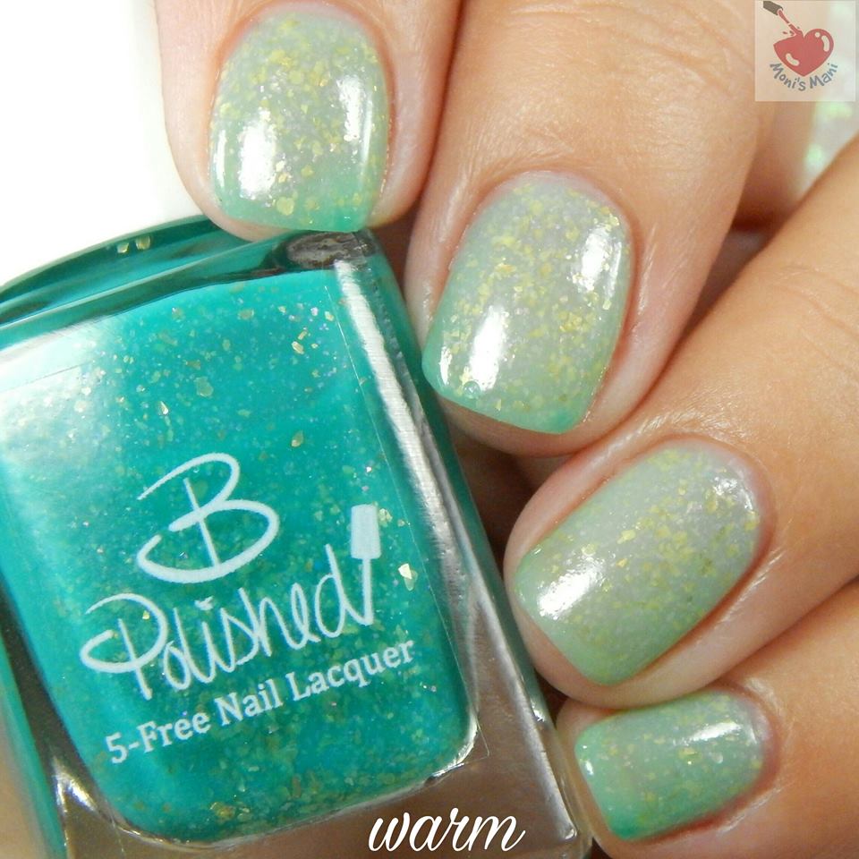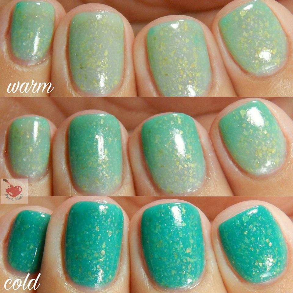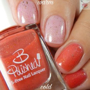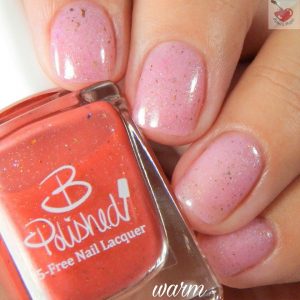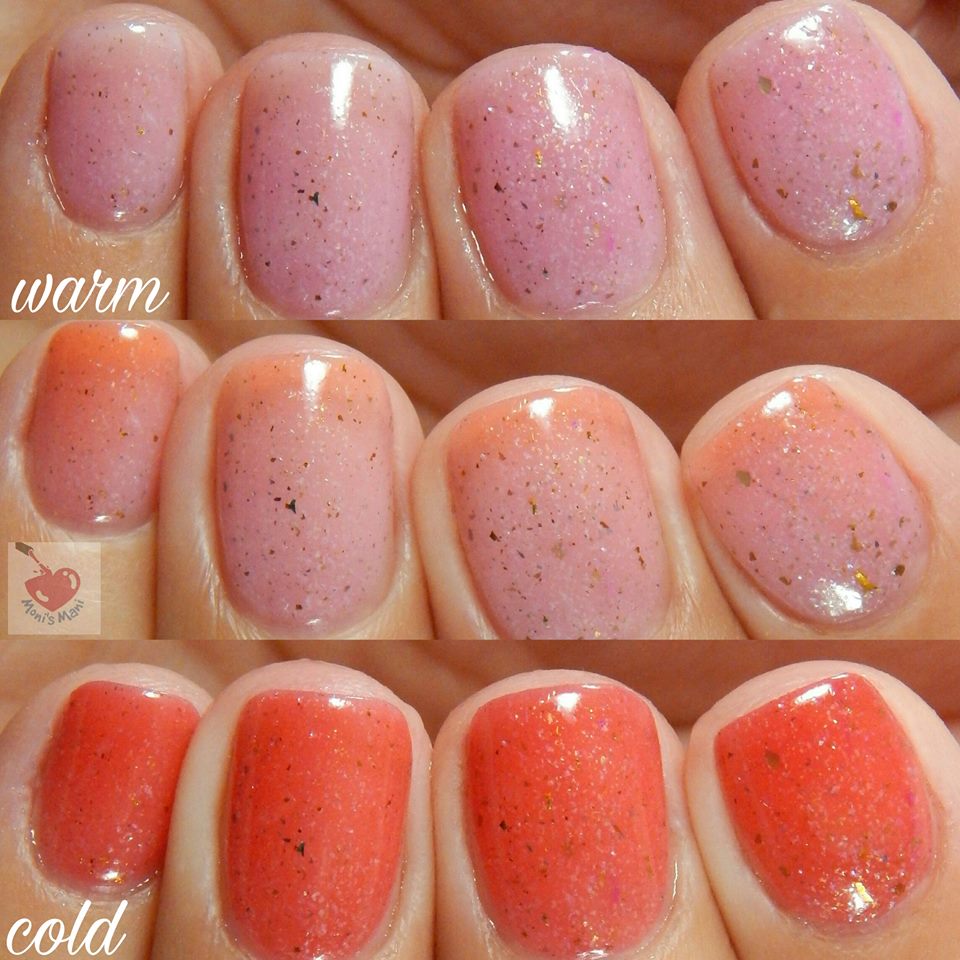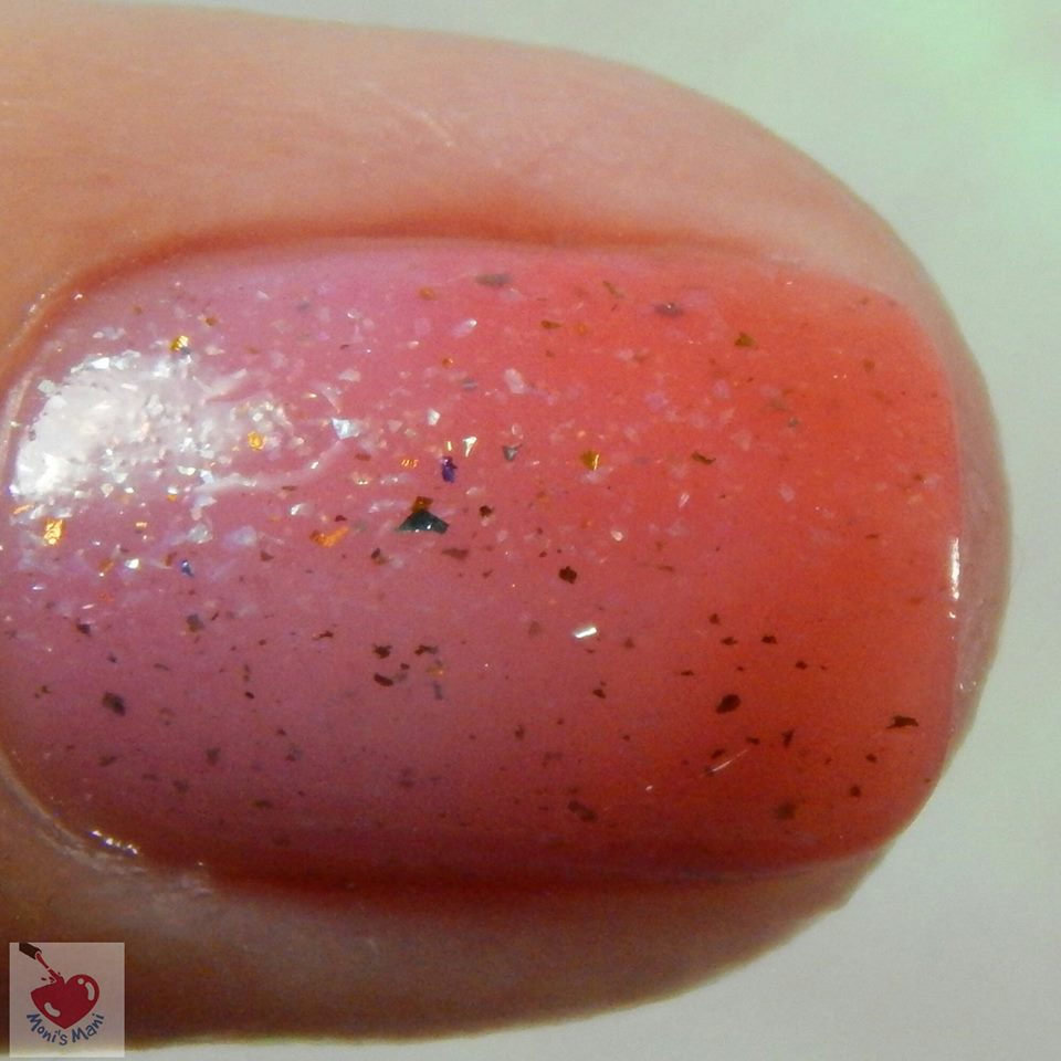 Dear Sweet Pea is a rose peach thermal that shifts to a pale soft pink. Inspired by the maker’s paternal grandmother who’s nickname for her was Sweet Pea . Dear Sweet Pea is another thermal shade that in it’s cold state is a vibrant rose coral and when warm is a very pale translucent pink. It also has green glass flecks and green to gold ultra chrome flakies. You see three thin coats plus glossy top coat in the pics